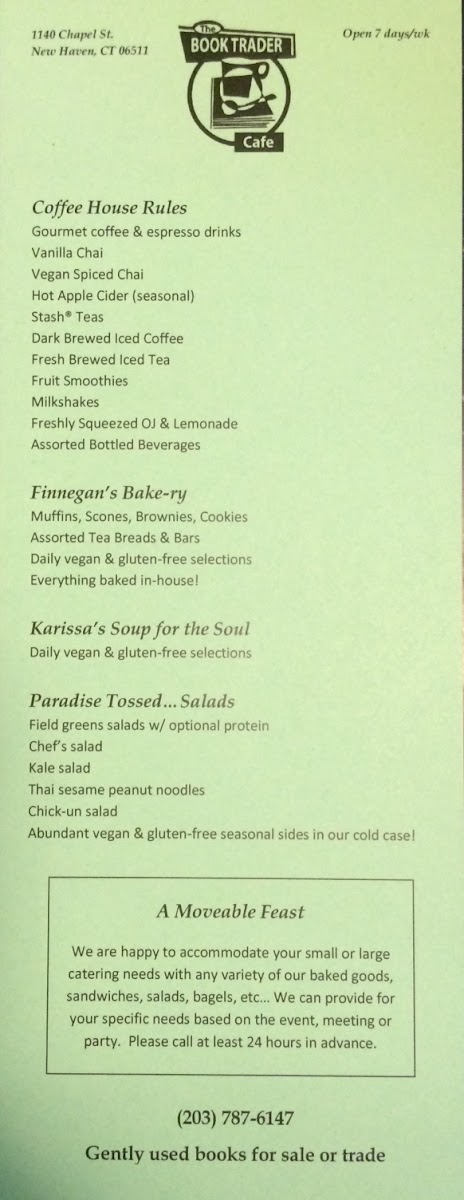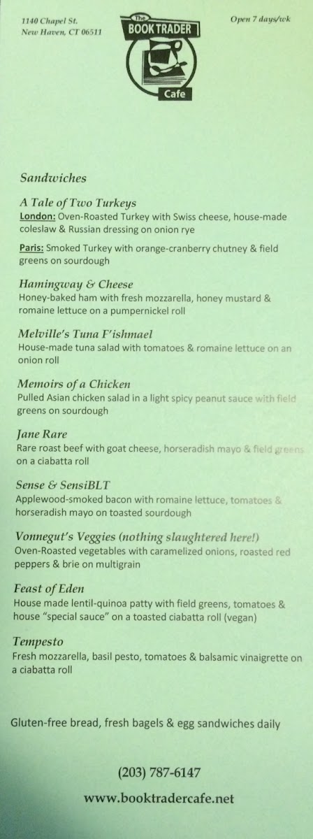 At Book Trader Cafe Menu, you'll find a warm, welcoming spot to indulge in comforting bites while enjoying the cozy ambiance of this charming New Haven café. Nestled on Chapel Street, the café offers a variety of fresh and flavorful dishes, each crafted with care. Whether you're in the mood for a hearty sandwich, a light salad, or a sweet treat to accompany your coffee, there's something to please every palate. Their selection of drinks, from rich, freshly brewed coffee to an array of teas, perfectly complements the menu items. The inviting atmosphere makes it the perfect place to grab a quick bite or settle in for a relaxing afternoon with friends.